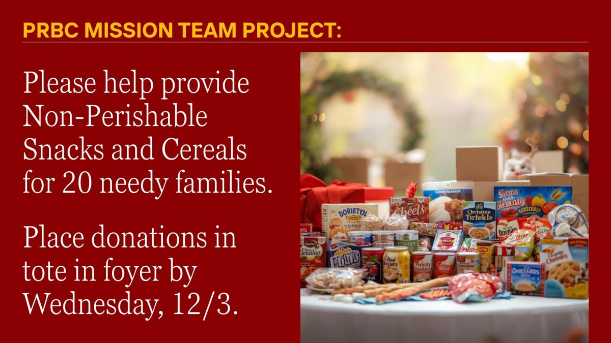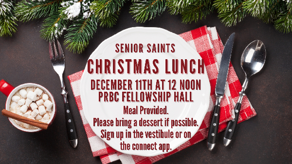 12/11/25 at 12 noon PRBC fellowship hall. Meal provided. Feel free to bring a dessert to share!
